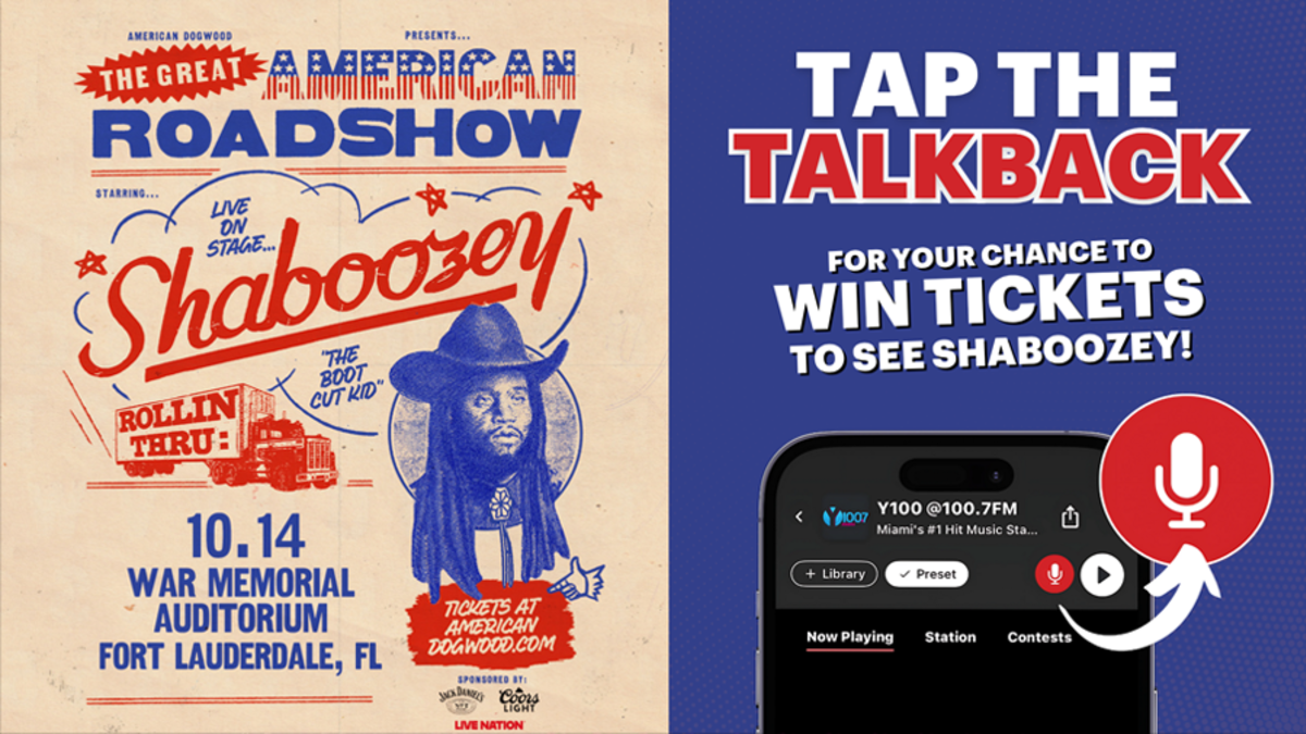 For a copy of these Official Rules, please visit https://y100.iheart.com/. List of Winner(s): For the name(s) of the winner(s), send a stamped, self-addressed envelope, to: iHeartMedia + Entertainment, Inc., Shaboozey Tap the Talk Back Winning Week Sweepstakes at 1200 SW 145th Ave. Suite 350 Pembroke Pines, FL 33027. Requests must be received within 30 days after the conclusion of the Sweepstakes.